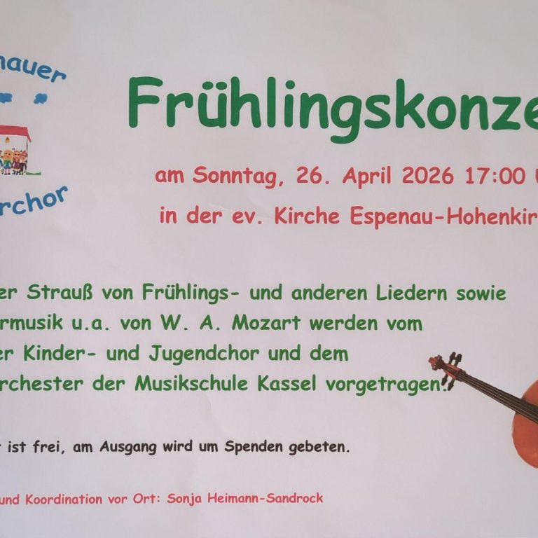 Frühlingskonzert Kinder- und Jugendchor Espenau Allgemein, Espenau, Familien, Jugend, Kinder, KonzertVon Holger Hermann14. April 2026 Details