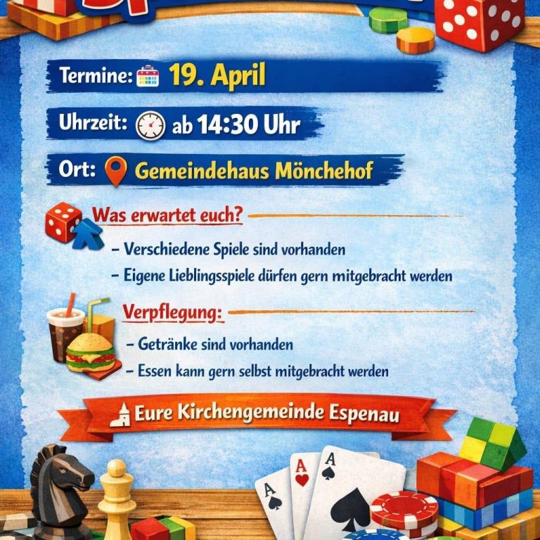 Spielenachmittag Allgemein, Espenau, Familien, Jugend, Kinder, KonfirmandenVon Holger Hermann14. April 2026 Details